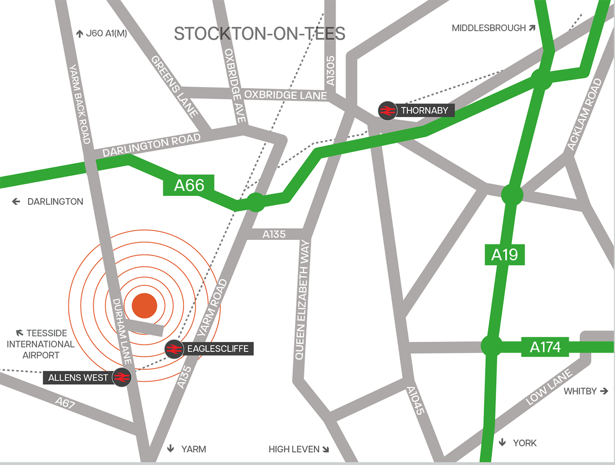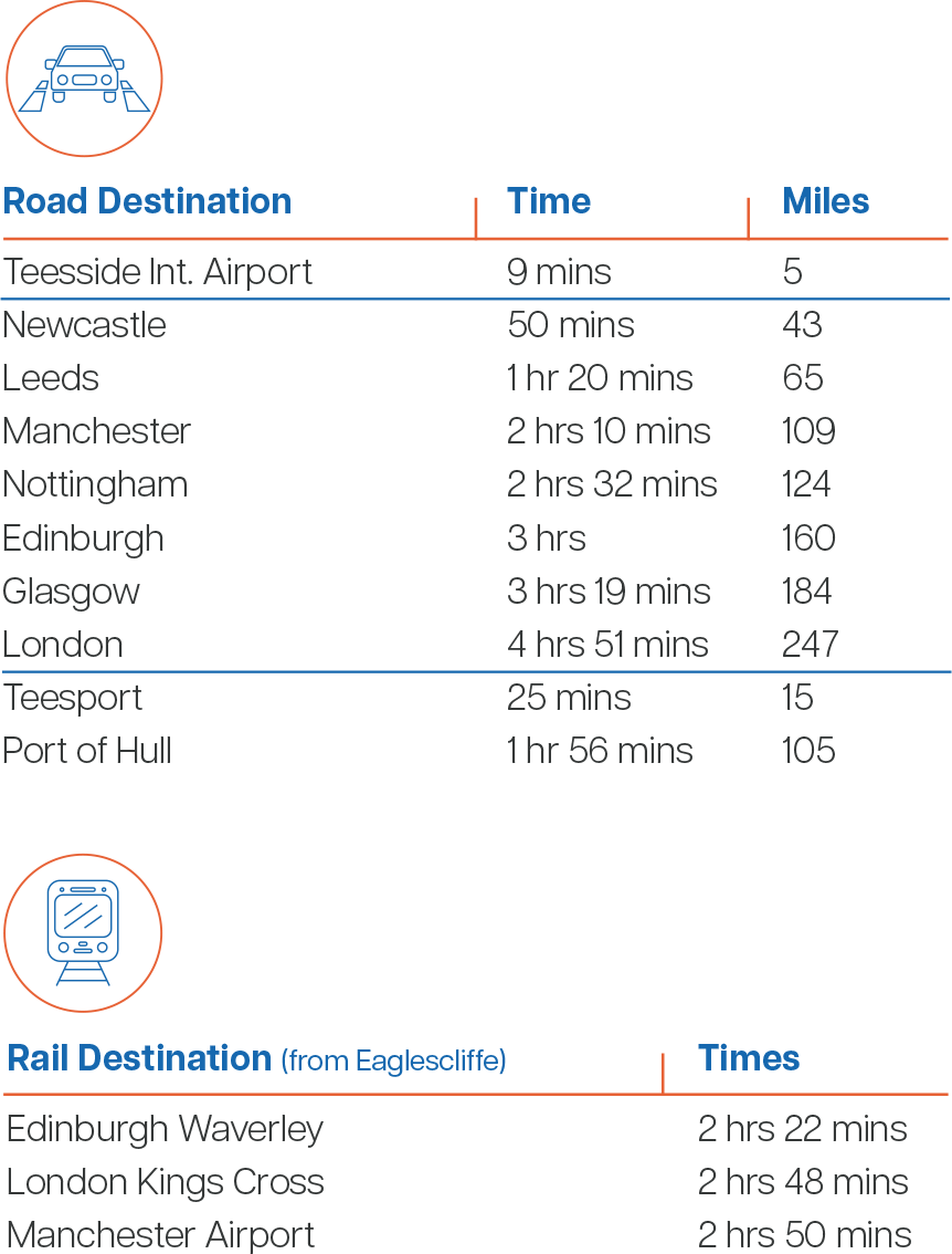 Eaglescliffe Railway Station is immediately adjacent offering direct services to Darlington, Stockton and surrounding conurbations. Eaglescliffe is on the Grand Central Line to London (4 trains daily) and provides a direct service to Manchester Airport. Teesside International Airport is approximately 5 miles from the site with Teesport being just 15 miles away (25 minutes).
